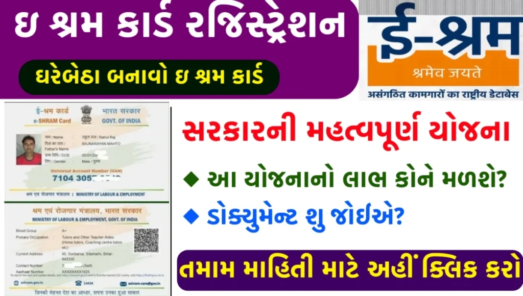 ભારત સરકાર દ્વારા અસંગઠિત ક્ષેત્રના કામદારો માટે શરૂ કરાયેલ ઈ-શ્રમ પોર્ટલ (eshram.gov.in / E Shram Card Registration) એક રાષ્ટ્રીય ડેટાબેસ છે, જ્યાં શ્રમિક પોતાનું રજીસ્ટ્રેશન કરી શકે છે. રજીસ્ટ્રેશન કર્યા પછી દરેક શ્રમિકને 12 અંકનો યૂએએન (UAN) નંબર અને ઈ-શ્રમ કાર્ડ આપવામાં આવે છે. આ કાર્ડના આધારે શ્રમિકોને સરકારી યોજનાઓ, વીમા અને પેન્શનના લાભ સરળતાથી મળે છે.
